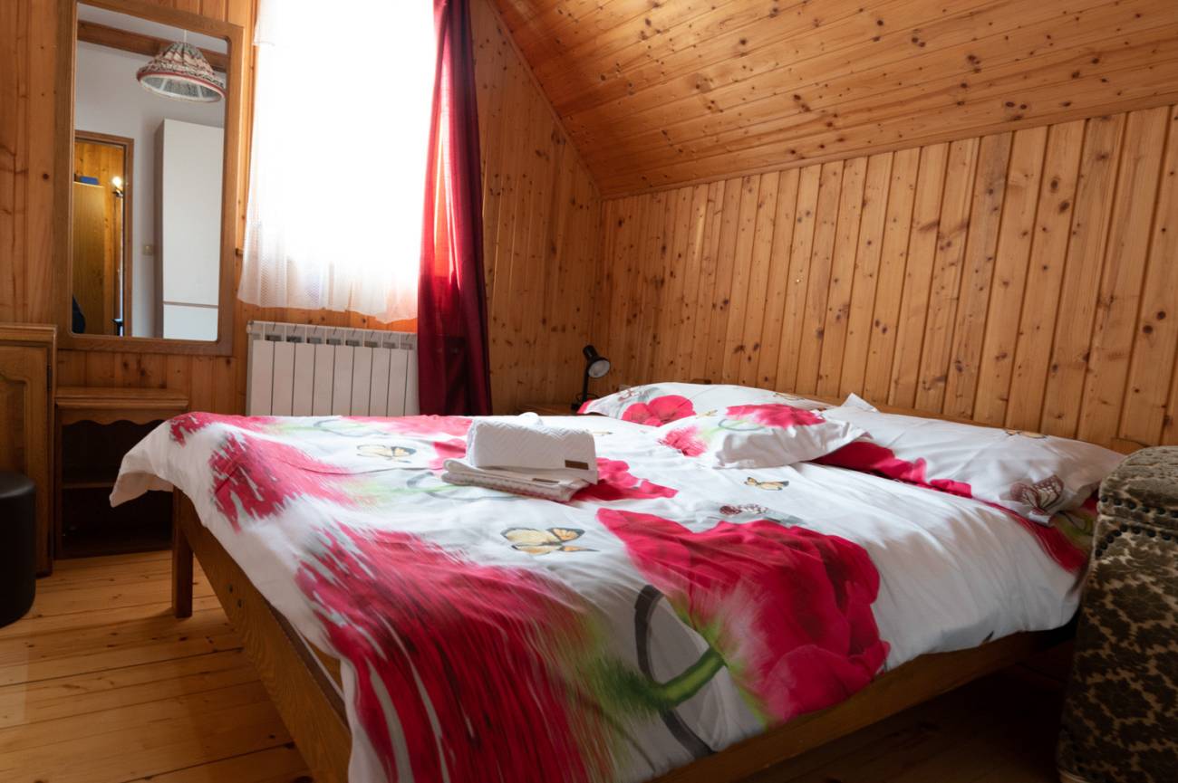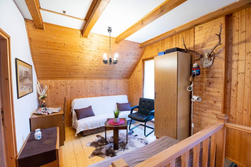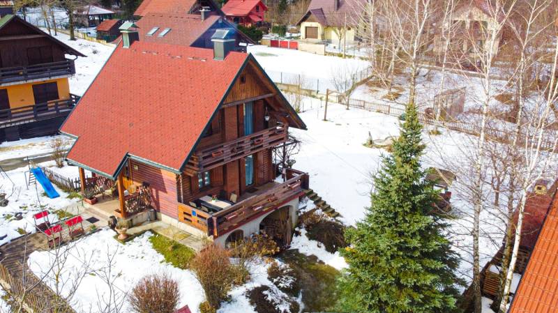 Tipična goranska kuća, opremljena i uređena za udoban boravak do 6 osoba ( 4 + 2 ). U prizemlju je dnevni boravak sa kaminom, kuhinjom, blagovaonicom i kupatilom, te izlazom na veliki balkon. Iz prizemlja unutarnjim stepenicama dolazi se u galeriju i 2 spavaće sobe u kojima se nalazi bračni krevet. Galerija ima balkon sa lijepim pogledom na prirodu.