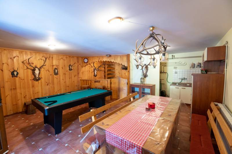 Idealno mjesto za opušteno druženje je konoba u suterenu, uređena u lovačkom stilu, sa kuhinjom, velikim drvenim stolom i klupama, biljarom i pikadom.