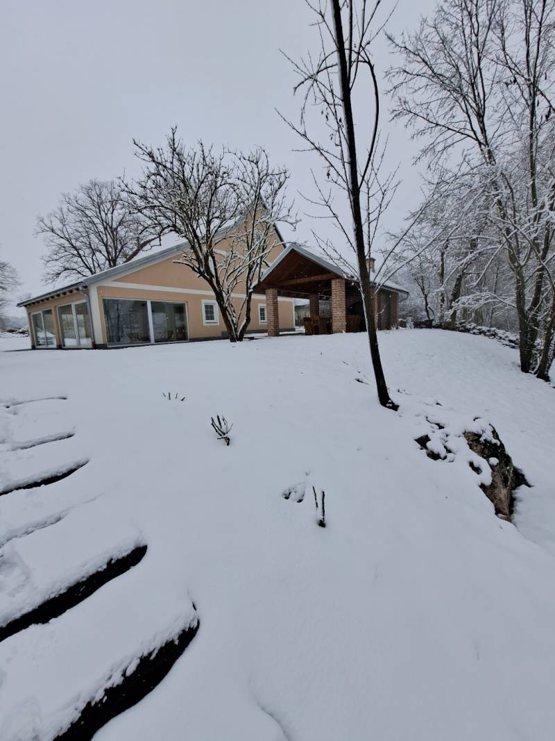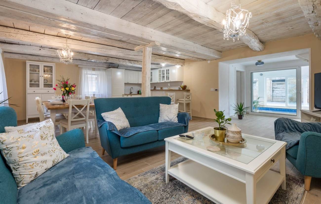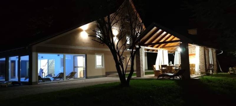 Sastoji se od unutarnjeg bazena, saune, 2 dnevna boravka, 2 kupatila, kuhinje, blagavaone i 3 spavaće sobe. Vani je sjenica sa roštiljem. Kuća ima popločano dvorište i besplatni parking te veliki vrt za opuštanje, šetnju, igru...