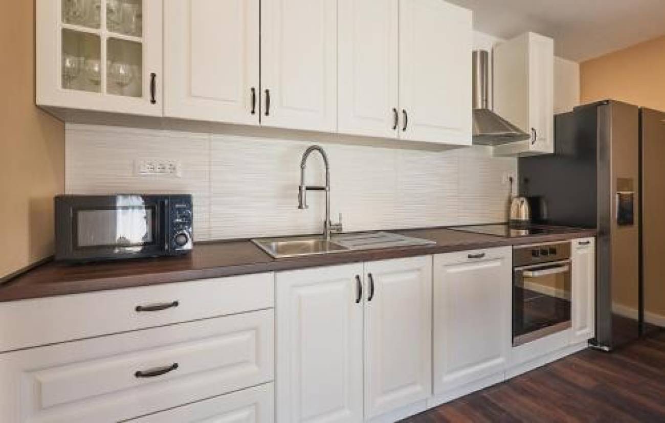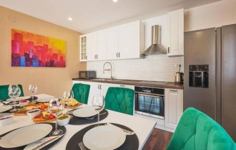 -Kuhinja sa svim potrebnim uređajima (Frižider sa ledomatom, perilica, ploča za kuhanje, pećnica, mikrovalna, kava apart, kuhalo za vodu), ulje, ocat, čajevi, kava, sol, šečer, začini